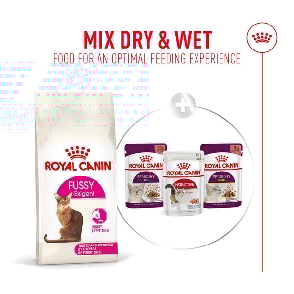 ROYAL CANIN Fussy je naše obzvláště chutná receptura pro vybíravé kočky, které mají tendenci odmítat svou potravu. Výživa vybíravých koček může být výzvou a naše efektivní receptura nabízí jednoduché řešení. Toto na míru šité krmivo je nutričně vyvážené a velmi chutné, s jedinečnou kombinací chutí a křupavou formou kroket.