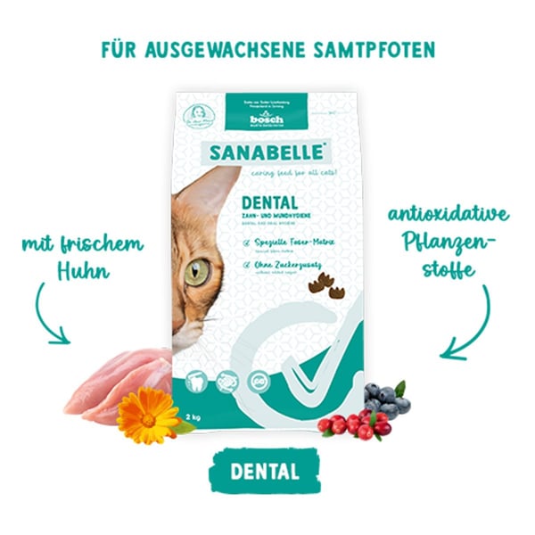 Sanabelle Dental je ideální volbou pro všechny dospělé kočky, které potřebují dodatečnou podporu ústní hygieny. Speciální vláknová matrice v tomto krmivu podporuje intenzivní žvýkání, což přispívá k lepšímu čištění povrchu zubů. S kvalitními, přírodními rostlinnými vlákny jako celulóza, hrachová vlákna a sušené řepné řízky nabízí Sanabelle Dental vysokou stabilitu kroket, které podporují efekt čištění zubů.