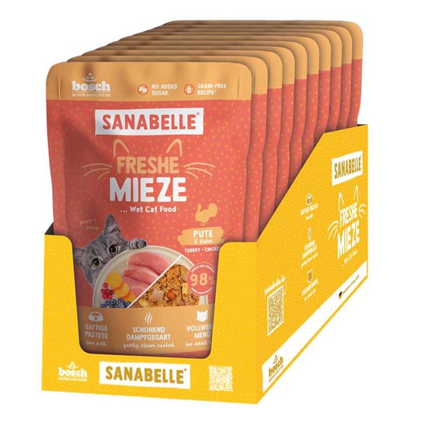 Sanabelle Freshe Mieze krůta & kuře nabízí vyváženou výživu pro kočky od 12. měsíce života. Vysoký podíl masa z čerstvého krůtího a kuřecího masa a výživných vnitřností zajišťuje chutné jídlo. Bez cukru a bez obilovin, toto krmivo je ideální pro výživově citlivé kočky.