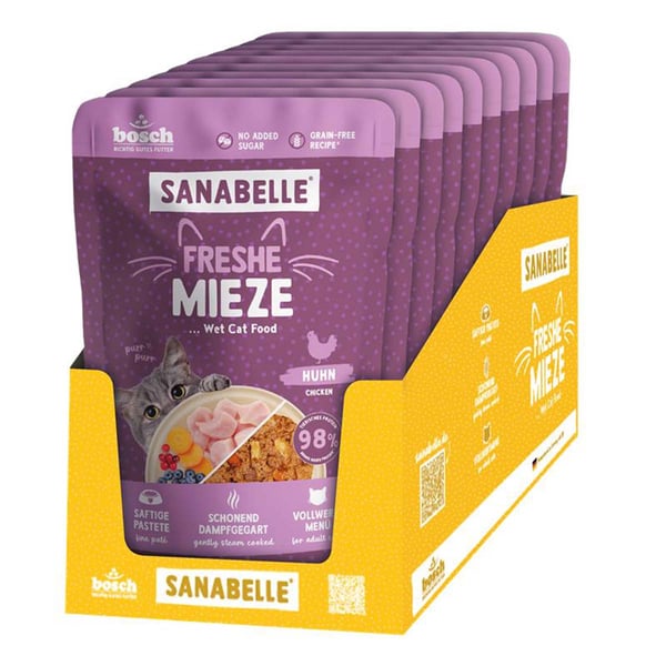 Sanabelle Freshe Mieze Huhn nabízí vaší kočce plnohodnotné kompletní krmivo, které bylo speciálně vyvinuto pro dospělé kočky od 12. měsíce života. S vysokým podílem čerstvého kuřete a výživných vnitřností je ideální pro kočky, které preferují stravu bez obilovin. Receptura je bez cukru a obilovin, což ji činí obzvláště stravitelnou.