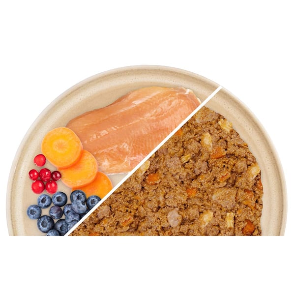 Pstruh (25 %), kuřecí vývar, kuřecí žaludky a kuřecí játra (20 %), krůta (15 %); kuřecí maso (10 %); mrkev (3 %); hydrolyzát bílkovin, želatina, lososový olej (0,3 %), vaječné skořápky, kvasnice (sušené), psyllium (0,1 %), šanta kočičí (sušená, 0,1 %), borůvka (sušená, 0,1 %), brusinka (sušená, 0,1 %), chlorid sodný, oxid hořečnatý.