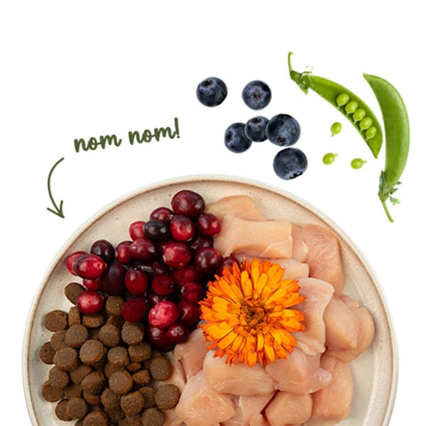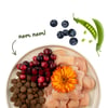 Čerstvé kuřecí maso (20 %), ječmen, kukuřice, drůbeží protein (sušený), živočišný tuk, proteinhydrolyzát, kukuřičný protein, rýžová mouka, hrách (sušený, 0,8 %), játrová moučka, uhličitan vápenatý, lososový olej (0,5 %), chlorid draselný, brusinky (sušené, 0,1 %), borůvky (sušené, 0,1 %), petržel (sušená, 0,1 %), kvasnice (sušené, 0,1 %), květy měsíčku (sušené (0,05 %)
