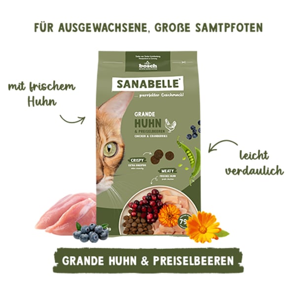 Díky obzvláště šetrnému procesu sušení nabízí Sanabelle Grande kuře jedinečnou křupavou zábavu. Extra porce živočišných bílkovin zajišťuje jedinečný chuťový zážitek, který přesvědčí i vybíravé kočky. Ať už je to dobrodruh, dáma, gaučový povaleč nebo dobrodruh – s Sanabelle je vaše kočka každý den skvěle zásobena a užívá si jídlo, které jí přináší radost.