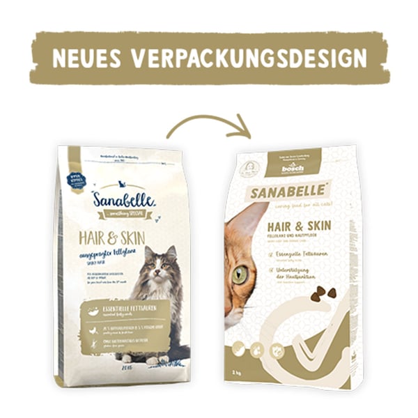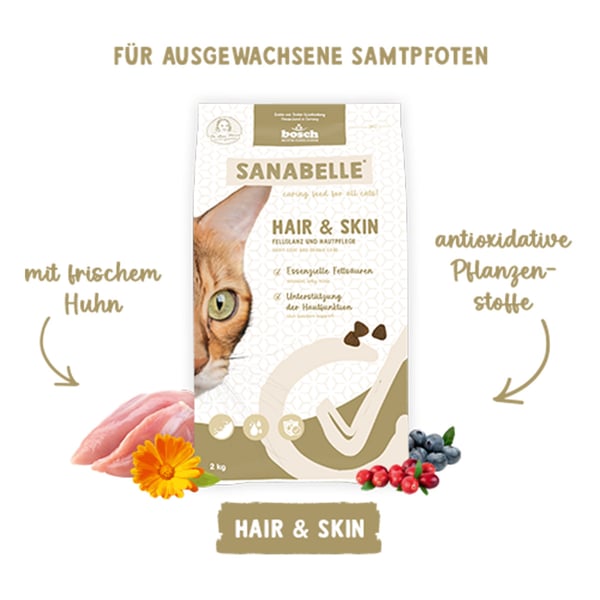 Sanabelle Hair & Skin je speciálně vyvinuté kompletní krmivo, které je přizpůsobeno potřebám dospělých dlouhosrstých koček. Toto vysoce kvalitní krmivo podporuje zlepšení vlastností srsti a zajišťuje hustou, lesklou srst. Díky cílenému výběru ingrediencí je zajištěna vysoká stravitelnost a akceptace, takže vaše kočka je optimálně zásobena.