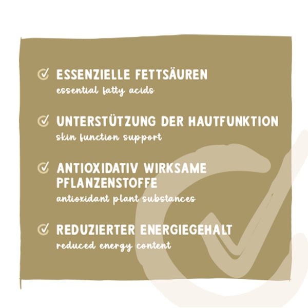 Receptura Sanabelle Hair & Skin obsahuje cenné omega-3 a omega-6 mastné kyseliny, které jsou rozhodující pro vývoj zdravé srsti. Lososový olej, lososová moučka a lněné semínko slouží jako důležité zdroje těchto mastných kyselin a přispívají k lesklé struktuře srsti. Tak zůstává srst vaší kočky vždy v nejlepším stavu.