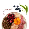 Čerstvé kuřecí maso (20 %), ječmen, kukuřice, drůbeží protein (sušený), škvarky (sušené), kukuřičný protein, čerstvé perličky (5 %), hrachová vláknina, hydrolyzát proteinu, sušené řepné řízky (odcukřené), živočišný tuk, rýže (1 %), játrová moučka, lososový olej (0,5 %), uhličitan vápenatý, hrách (sušený, 0,4 %), chlorid draselný, brusinky (sušené, 0,1 %), borůvky (sušené, 0,1 %), petržel (sušená, 0,1 %), kvasnice (sušené, 0,1 %), květy měsíčku (sušené, 0,05 %)