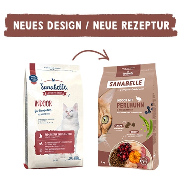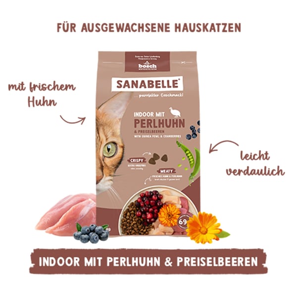 Sanabelle Indoor s perličkou je ideální volbou pro kočky, které žijí převážně v domě. Tato kompletní strava je speciálně přizpůsobena nižší energetické potřebě domácích koček a nabízí vyváženou kombinaci esenciálních vitamínů a stopových prvků. Tak podporuje denní potřeby vaší kočky, jako je pohybový aparát, trávení a metabolismus, a přispívá k lesklé srsti.