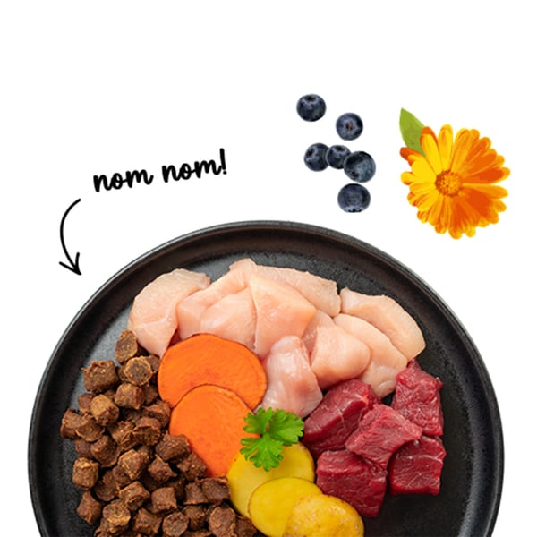 Čerstvé kuřecí maso (32,5 %), čerstvé hovězí maso (30 %), vepřové bílkoviny (sušené), čerstvá játra, sladké brambory (sušené, 5 %), glycerin (rostlinný), hydrolyzát bílkovin, bramborové bílkoviny (2,5 %), celulóza, drůbeží bílkoviny (sušené), dikalciumfosfát, lososový olej (0,5 %), živočišný tuk, kvasnice (sušené, včetně 0,1 % mannanoligosacharidů, 0,06 % beta-glukanů), bramborová vláknina, uhličitan vápenatý, yucca (sušená), brusinky (sušené, 0,1 %), borůvky (sušené, 0,1 %), slávky zelenoústé (sušené), petržel (sušená), kapoková vláknina, květy měsíčku (sušené)