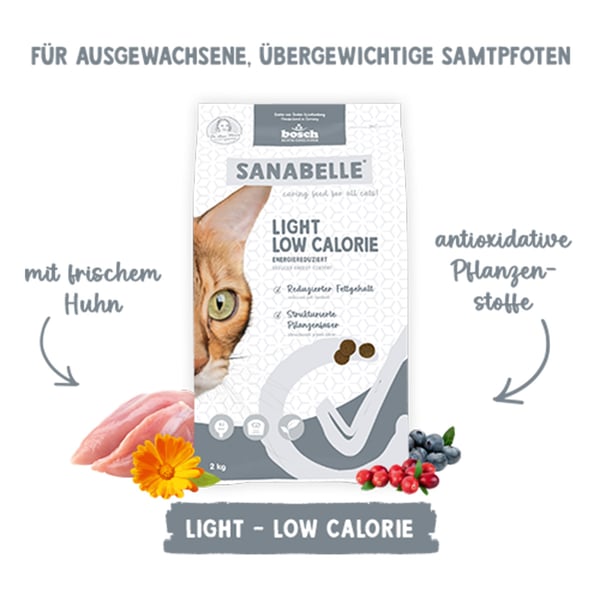 Sanabelle Light Low Calorie je ideální volbou pro obézní a málo aktivní kočky. Tato energicky redukovaná kompletní strava pomáhá vaší kočce udržet nebo dosáhnout její ideální hmotnosti. Snížený obsah tuku zajišťuje, že energetický obsah je optimálně přizpůsoben potřebám vaší kočky. Tak může Sanabelle Light Low Calorie vaši kočku efektivně podpořit při redukci hmotnosti.