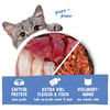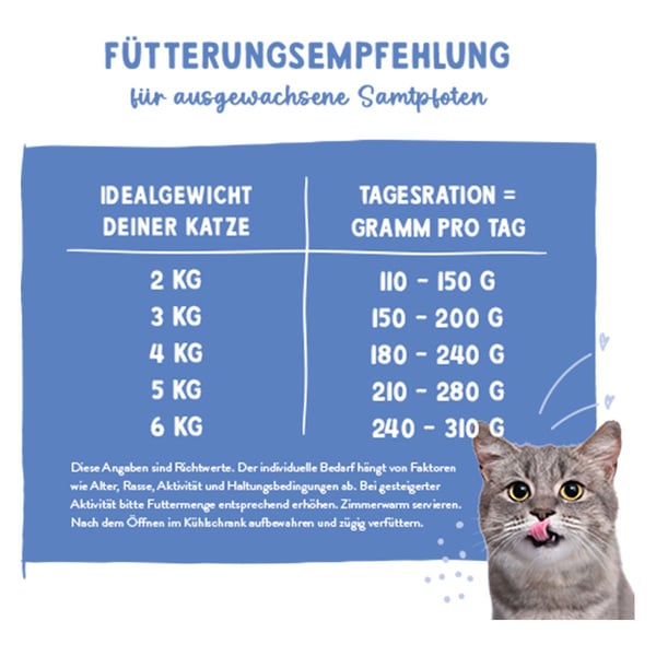 Naše menu pro labužníky obsahuje kromě čerstvého pstruha (20 %) také 30 % čerstvého hovězího masa a čerstvých vnitřností (18 %, z toho 3 % čerstvá játra). Extra porce lososového oleje dodá kočce nenasycené mastné kyseliny pro jemnou, elegantní srst.