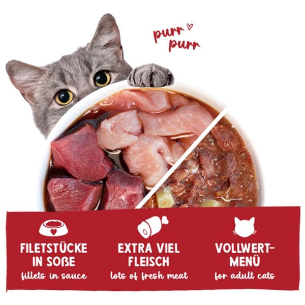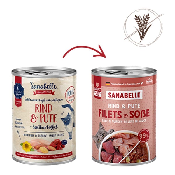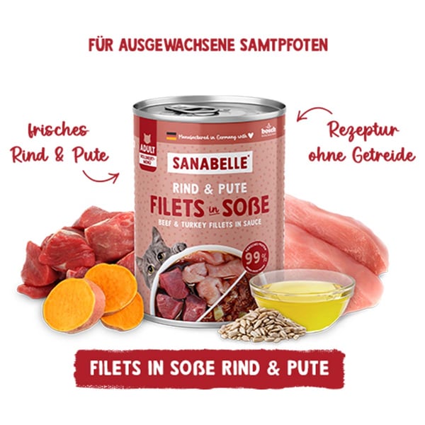 Sanabelle Adult se šťavnatým hovězím a krůtím masem, batáty a slunečnicovým olejem je kompletní krmivo pro dospělé kočky s masem té nejvyšší kvality v jemné omáčce.