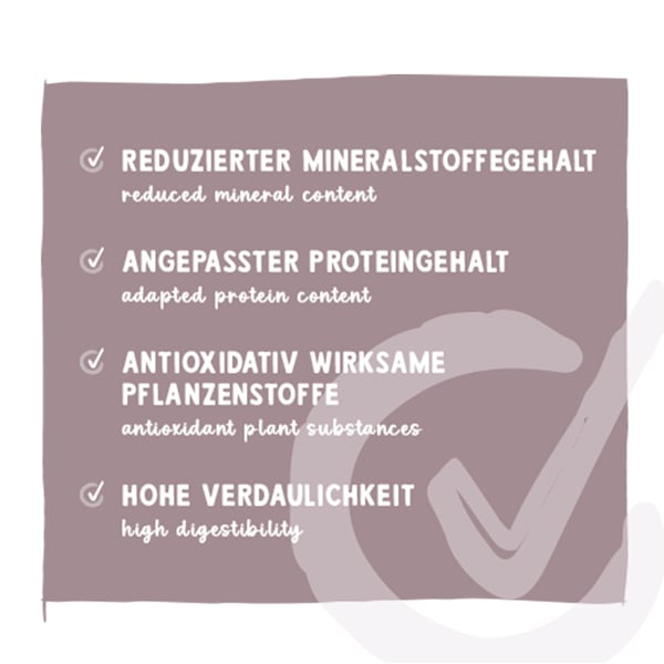 Šetrná receptura Sanabelle Urinary se vyznačuje přizpůsobeným obsahem proteinů, který podporuje udržení přizpůsobené pH-hodnoty moči. Snížený obsah proteinů snižuje močové odpadní produkty a je ideální pro kočky, které mají citlivé trávení. Tak si můžete být jisti, že vaše kočka dostává šetrnou a zároveň výživnou stravu.