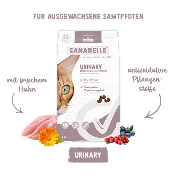 Sanabelle Urinary je speciálně vyvinuto pro dospělé kočky, které jsou citlivé na své močové orgány. Receptura se sníženým obsahem minerálních látek, zejména vápníku a fosforu, optimálně podporuje ledviny a může působit proti tvorbě močových kamenů. S tímto krmivem nabízíte své domácí kočce vyváženou výživu, která je přizpůsobena jejím speciálním potřebám.