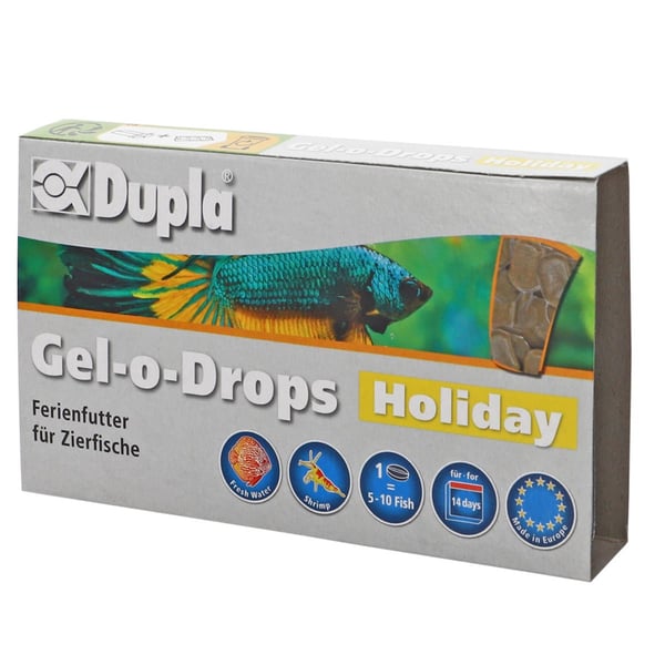 Plánujete delší dovolenou a nikdo nemůže nakrmit vaše ryby? S tabletami Gel-O-Drops Holiday to již není problém. Prázdninové krmivo je ideální pro krmení všech tropických okrasných ryb během dovolené. Jedna tableta vystačí na 14 dní pro 5–10 ryb v závislosti na jejich velikosti. Díky speciální konzistenci se tablety Gel-O-Drops Holiday jednoduše nerozpustí, ale zachovají si svůj tvar a zvířata je během dovolené postupně okusují.