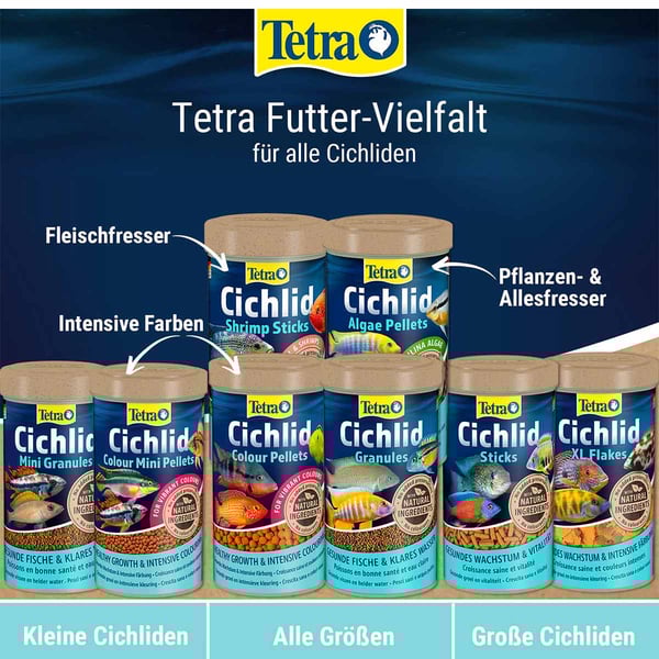Tetra Cichlid Sticks je vyvážené kompletní krmivo pro všechny masožravé cichlidy. Díky své konzistenci tyčinky plavou na hladině, což pro ryby představuje přirozenou situaci spojenou s lovem, resp. krmením. Více se tak pohybují a jsou viditelně spokojené.