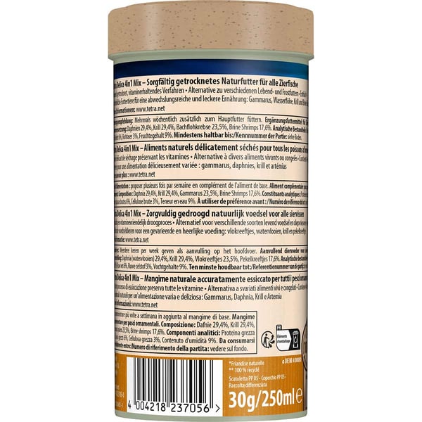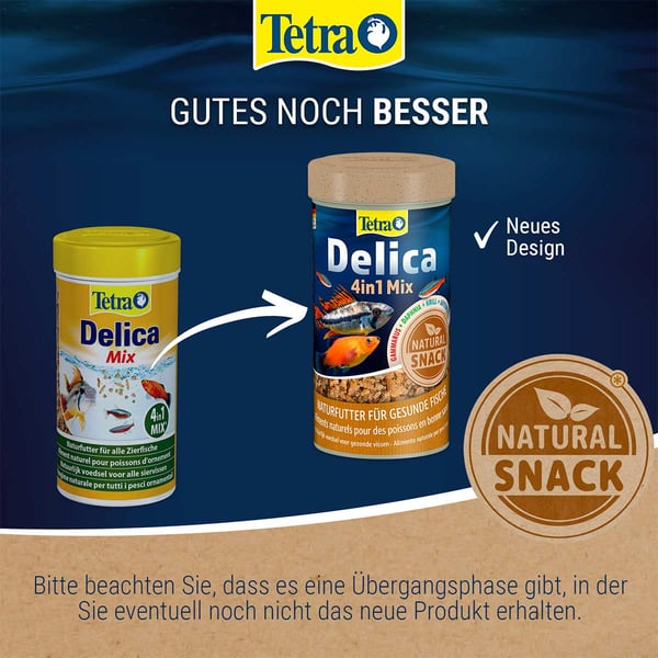 Tetra Delica Mix se báječně hodí jako pamlsek mezi krmeními okrasných ryb. Vysoce kvalitní krmivo pro ryby garantuje druhovou a pestrou výživu.Vysoký podíl proteinů vaše milované rybičky zásobuje další energií. Podíl minerálů poskytuje přírodní vlákninu, která podporuje zdravé zažívání. Obsah gammaru zajišťuje zintenzivnění barevné nádhery vašich okrasných ryb.