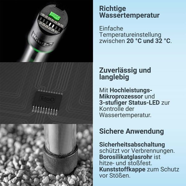 Tetra HT Heater Electronic je vybaven tepelně a nárazuvzdornou borosilikátovou skleněnou trubicí, která v kombinaci s integrovaným bezpečnostním vypnutím zajišťuje maximální bezpečnost. Robustní konstrukce zaručuje dlouhou životnost a ochranu pro vaše ryby.