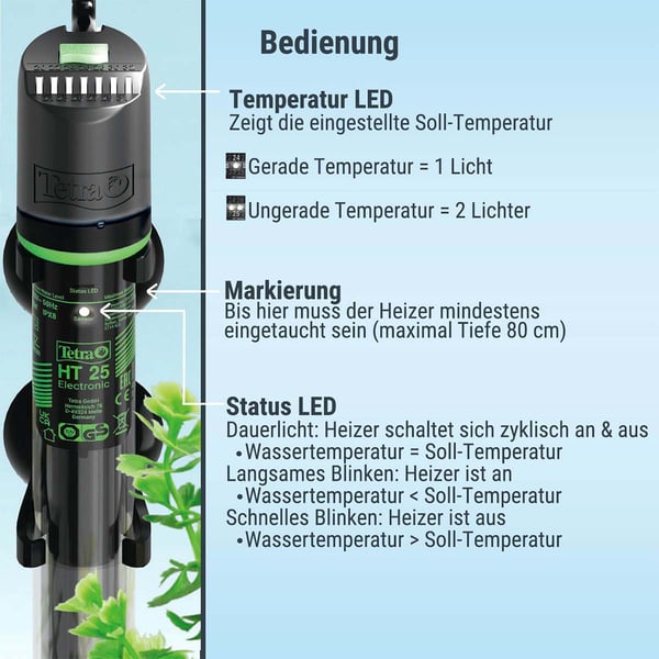 Integrovaná 3-stupňová stavová LED umožňuje snadnou a rychlou kontrolu aktuální funkce ohřívače. Tak můžete zajistit, že teplota ve vašem akváriu je vždy v požadovaném rozmezí a vaše ryby se cítí pohodlně.