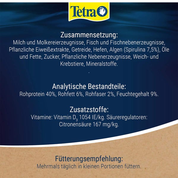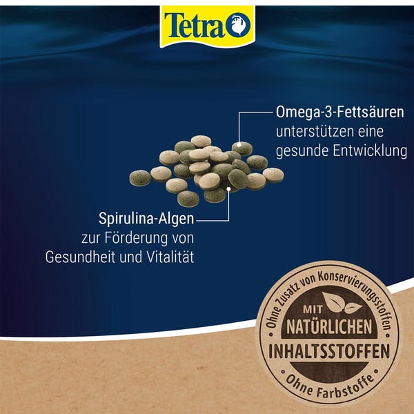 Podávejte jen takové množství, které ryby dokážou zkonzumovat během cca 30 minut. Používejte tablety pro společná akvária spolu s TetraMin vločkami/granulemi nebo TetraPro. Pro zajištění pestré výživy vašich ryb podávejte 2× až 3× týdně Tetra Delica.