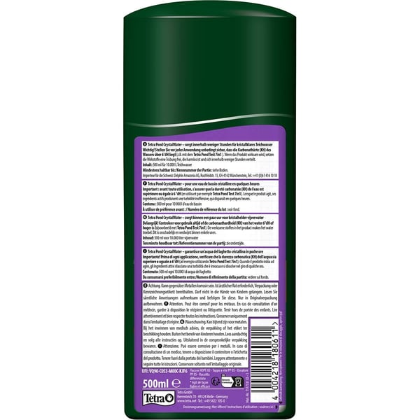 Důležité: Před každým použitím je nutné zkontrolovat, zda je karbonátová tvrdost vody (KH) vyšší než 3° dH (např. pomocí produktu Tetra Pond Test 6iv1). Je-li zjištěna příliš nízká hodnota, doporučuje se provést kontrolované zvýšení karbonátové tvrdosti např. pomocí prostředku Tetra Pond pH/KH Plus. Dávkování: Odměrkou dávkujte 50 ml prostředku Tetra Pond CrystalWater na každých 1 000 l vody v jezírku. Optimální účinek zajistíte tak, že produkt s vodou v jezírku důkladně promícháte. Nesmí se dostat do rukou dětí!