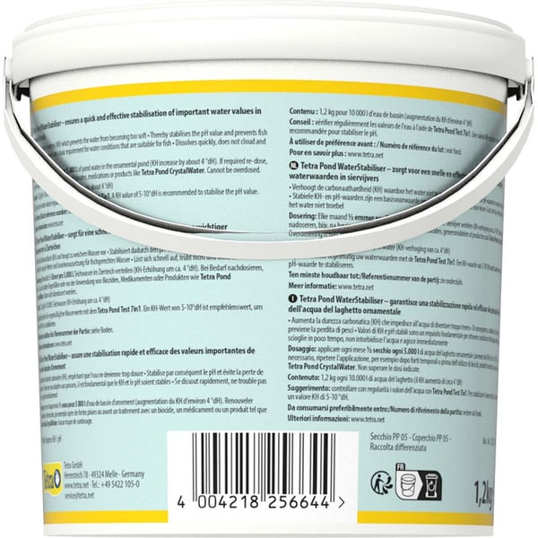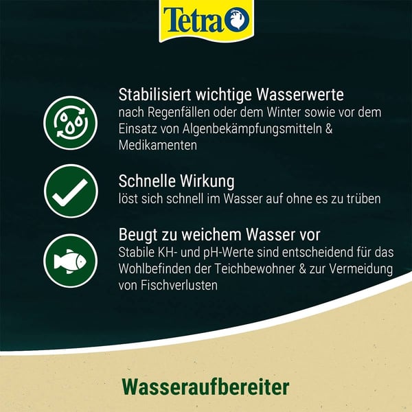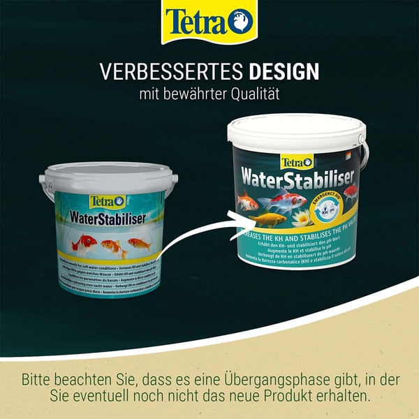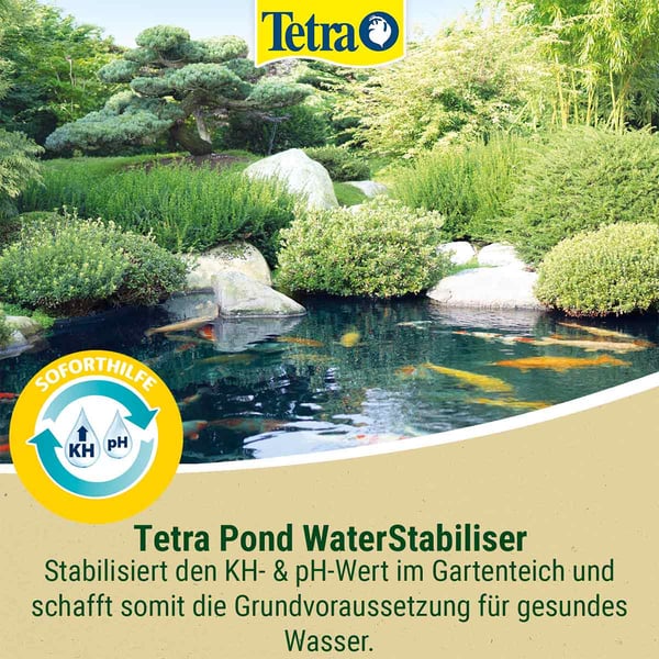 Tetra Pond WaterStabiliser vyrovnává přirozené, průběžné snižování KH v jezírkové vodě a zajišťuje, aby voda nebyla příliš měkká. Hodnota KH (uhličitanové tvrdosti) může prudce klesnout zejména po delších deštích. Stabilizuje také hodnotu pH a tím zabraňuje ztrátám ryb. Stabilní hodnoty KH a pH jsou základním předpokladem zdravé vody a dobré kondice ryb a všech obyvatel zahradního jezírka. Kromě toho jsou stabilní hodnoty vody často předpokladem pro použití dalších přípravků pro péči o jezírko. Tetra Pond WaterStabiliser se v zahradním jezírku rychle rozpouští, nezakaluje vodu a působí okamžitě.