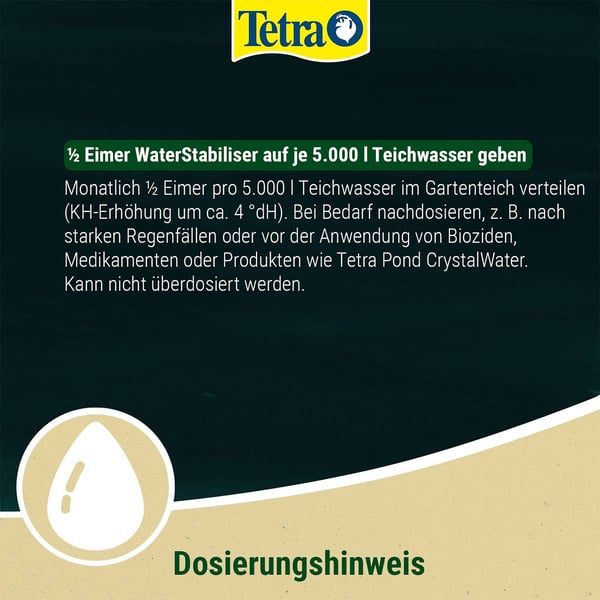 Použijte 600 g přípravku Tetra Pond WaterStabiliser na 5 000 litrů vody v jezírku měsíčně (zvýšení KH o cca 4° dH).