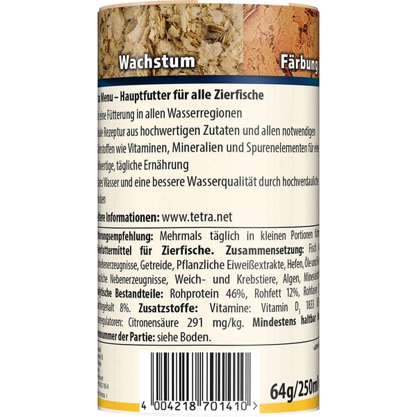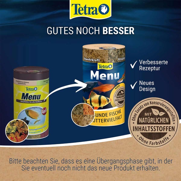 TetraMenu je krmná směs ze 4 různých druhů vloček ve 4 oddělených komorách pro zábavnější krmení. Dóza obsahuje v každé ze čtyř oddělených přihrádek jeden druh vloček: žluté vločky podporují zdravý růst ryb, hnědé vločky zvyšují odolnost, zelené vločky podporují vitalitu a červené vločky zlepšují plodnost. Díky tomu je možné cíleně volit podávání výživné stravy, růstového krmiva, krmiva na podporu vitality a rostlinné stravy.