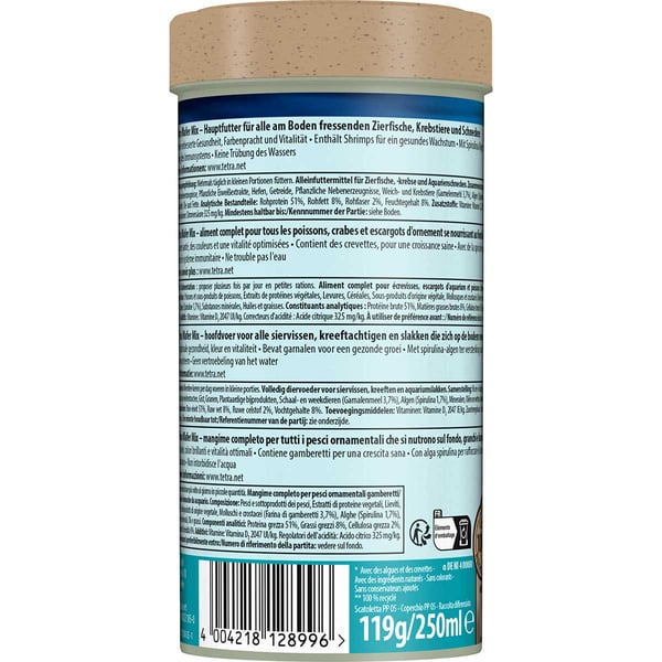 Tetra Wafer Mix 1 l pro korýše a ryby žijící u dna, živící se masem a rostlinnou stravou. Díky pevné konzistenci nedochází k zakalení vody v akváriu. Tvarově stálé granule vyhovují přirozenému chování při krmení.