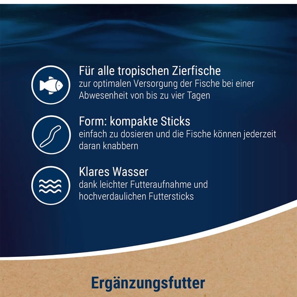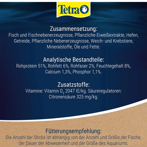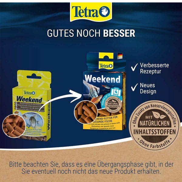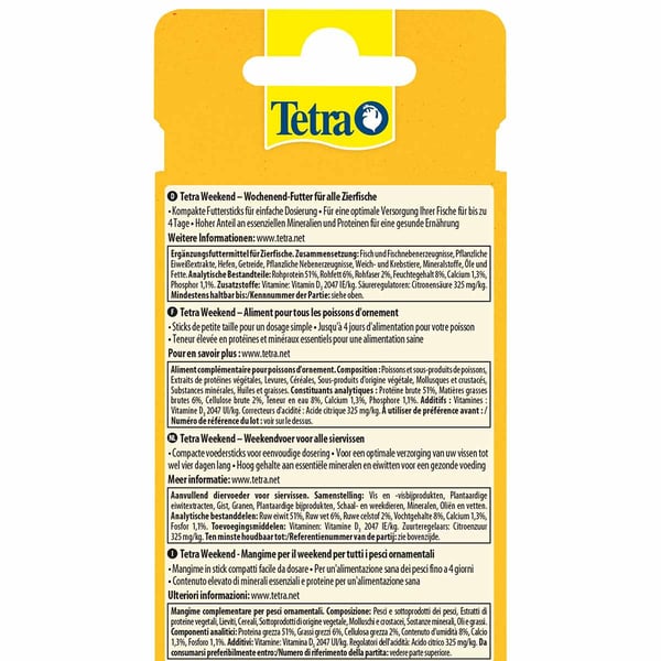 TetraMin Weekend – kompaktní tyčinky pro přísun potravy všech okrasných ryb o víkendech nebo v době dovolené. Tyto tyčinky mají vysoký podíl životně důležitých minerálních látek a mimoto vysoký obsah bílkovin.
