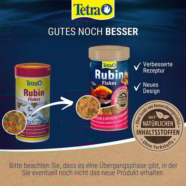 TetraRubin normální vločky vločkové krmivo s přírodními zesilovači barev pro vyšší barevnou intenzitu. Díky speciálním surovinám (bez hormonů) zdůrazňuje přirozeně krásné zbarvení ryb. Zvýraznění barev je patrné již po dvou týdnech krmení.