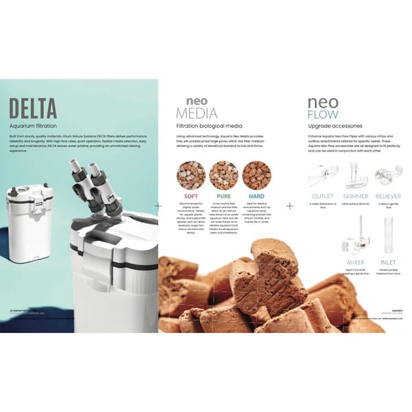 UNS Delta 90 a 120: 2x regulační ventil průtoku, motorová hlava, O-kroužek, kanistr a svorka, 4x nožičky, sifonová pumpa, manžeta svorky kanistru, oběžné kolo s krytem, hřídel a kryt, 2x filtrační hadice, Aquario Neo vstup a výstup, 2x Aquario Neo držák, koš na média s krytem, Aquario Neo média, 2x bio houba (zelená/černá)