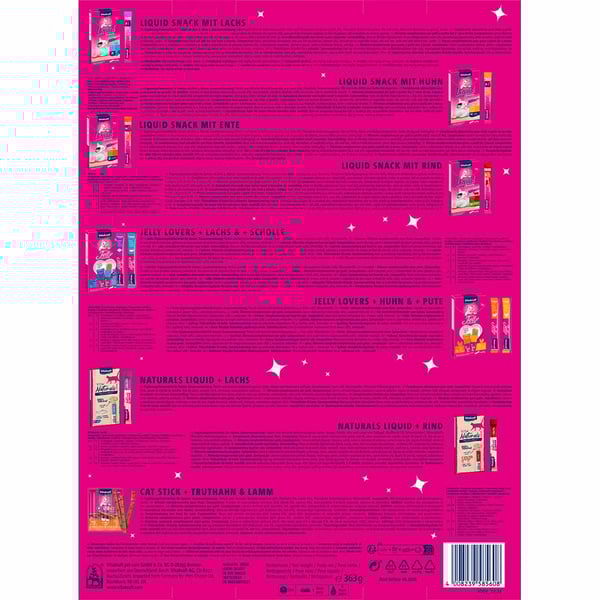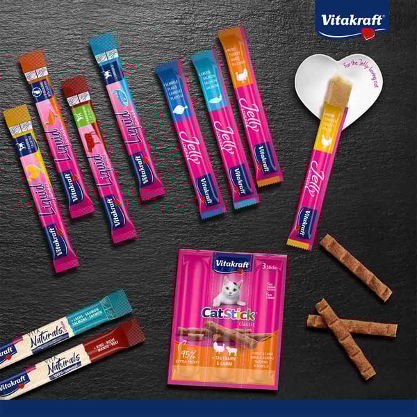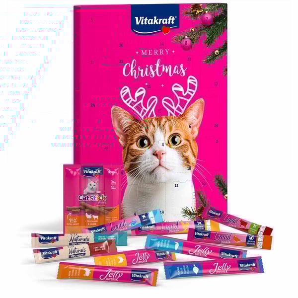 Společně si užívejte předvánoční čas! S novým Vitakraft® adventním kalendářem pro kočky mohou milí domácí mazlíčci během adventu den co den být rozmazlováni lahodným překvapením. A jako vrchol pro Štědrý večer láká svůdné balení 3 Cat Sticks. Lahodné! Ať už s hovězím nebo kuřecím, krůtím nebo lososem: Pečlivě sestavený výběr lahodných tekutých nebo želé pamlsků zvyšuje sáček po sáčku radostné očekávání Vánoc. Například za některými z 24 dvířek jsou obsaženy krémově lehké tekuté pamlsky – ve čtyřech lahodných příchutích a s cenným přídavkem pro zvíře. Také jsou zde želé pamlsky Jelly Lovers, všechny čtyři příchutě vyrobené bez přidání obilovin a cukru. Absolutní vrchol pro všechny kočky, které milují želé produkty! Také Vita® Naturals Liquid jsou v tomto kalendáři skryty. Pamlsky přesvědčují 100% přírodními ingrediencemi a skutečnými kousky masa z hovězího nebo skutečnými kousky ryb z lososa. Rozmanitá pestrost, která nechá kočičí srdce bít rychleji! Všechny pamlsky z dvířek 1-23 jsou baleny v sáčku a mohou být buď podávány čisté jako pamlsek – nebo slouží jako poleva pro hlavní krmivo, aby se zvýšila jeho přijatelnost.