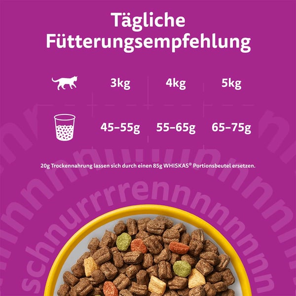 Suché krmivo Whiskas 1+ s kuřecím masem je ideální k dennímu krmení vašeho čtyřnohého miláčka. Toto výživné suché krmivo má mimořádně plnou chuť. Toto vyvážené krmivo pro dospělé kočky obsahuje cenné vitaminy a minerální látky, které podporují zdravý způsob života. Navíc jeho složky ideálně přispívají ke zdraví močových cest. Toto krmivo navíc díky jemnému abrazivnímu účinku podporuje zdraví zubů vašeho mazlíčka. Navenek křupavé a uvnitř měkké – neodolatelně chutná konzistence.