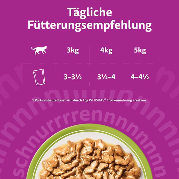 Porci 1 kapsičky lze nahradit 16 g granulí WHISKAS. Zohledněte kalorie obsažené v pamlscích. Množství krmiva je pouze orientační. Množství krmiva přizpůsobte věku, velikosti a aktivitě vaší kočky. Krmivo rozdělte do několika porcí během celého dne. Zajistěte svému psovi dostatek čerstvé pitné vody. Podávejte při pokojové teplotě.