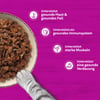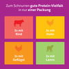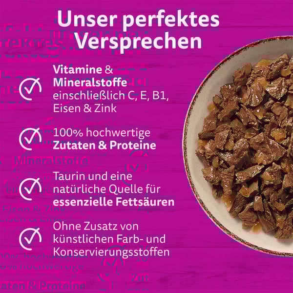 s hovězím masem: maso a vedlejší produkty živočišného původu (20 %, 97 % přírodní*; mj. 4 % hovězí kousky**), rostlinné bílkovinné extrakty, minerály (0,7 %), cukr, vedlejší produkty rostlinného původu. *Přírodní přísady. **Malé kousky tvoří 33 % výrobku.
