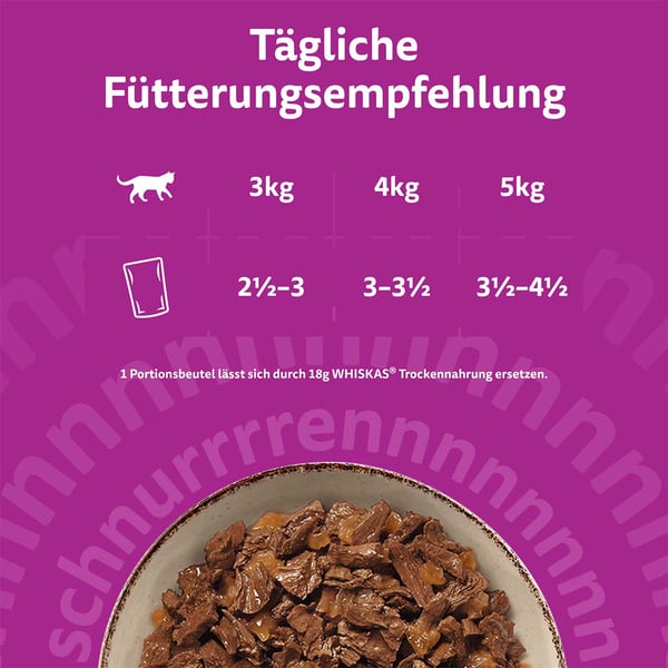 Porci 1 kapsičky lze nahradit 16 g granulí WHISKAS. Zohledněte kalorie obsažené v pamlscích. Množství krmiva je pouze orientační. Množství krmiva přizpůsobte věku, velikosti a aktivitě vaší kočky. Krmivo rozdělte do několika porcí během celého dne. Zajistěte svému psovi dostatek čerstvé pitné vody. Podávejte při pokojové teplotě.