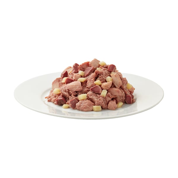 45 % kuřecí filet, 28,8 % vývar, 5 % kuřecí játra, 5 % kuřecí žaludky, 5 % kuřecí tuk, 3 % jehněčí plíce, 3 % brambor, 2 % jehněčí srdce, 2 % hruška, 1 % minerální látky, 0,2 % lososový olej.